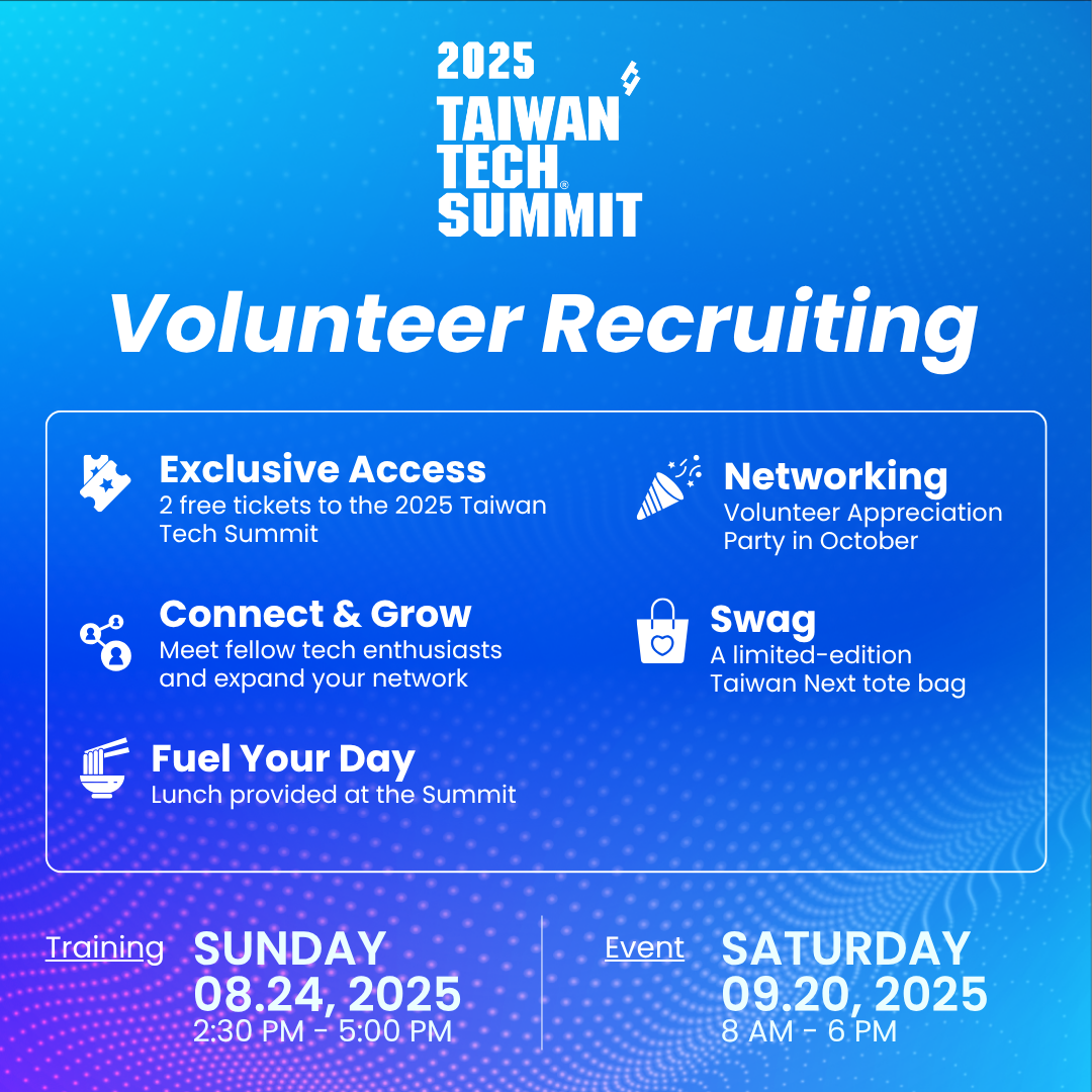 這是一個與來自各產業的優秀台灣人才、企業領袖、投資人及市場專家交流的絕佳機會!不僅有助於拓展人脈,更可能為您的職涯發展開啟新的契機。如果您對協助籌辦大型活動充滿熱情,歡迎加入我們,一起打造今年最具影響力的台灣科技盛會!