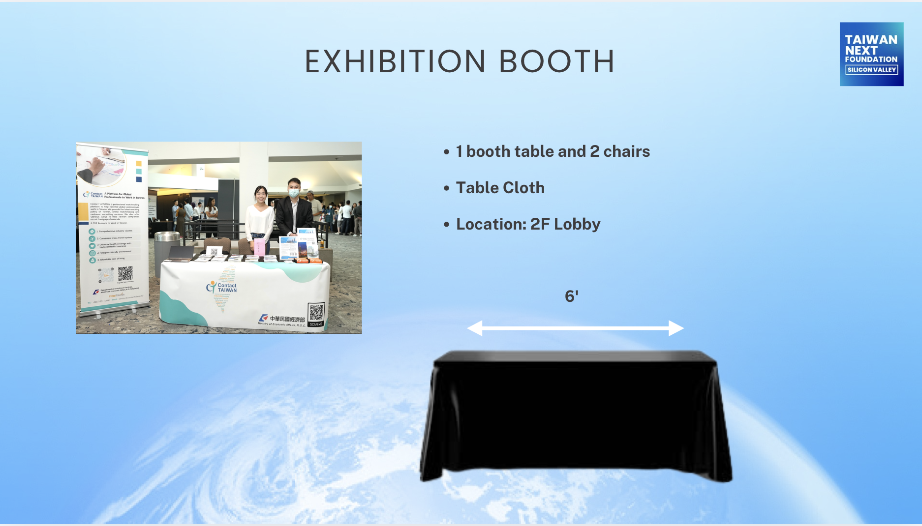 Furniture: One 6-foot draped table (black) and two chairs.